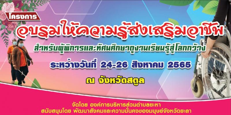 โครงการอบรมให้ความรู้ส่งเสริมอาชีพสำหรับผู้พิการ และทัศนศึกษาดูงานเรียนรู้สู่โลกกว้าง ณ จังหวัดสตูล ประจำปี 2565 ระหว่างวันที่ 24 - 26 สิงหาคม 2565