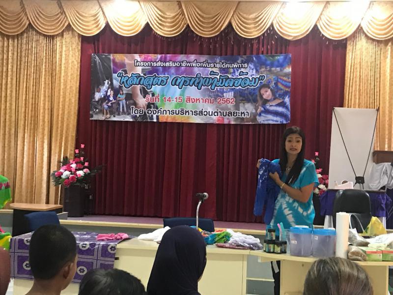 รายละเอียด : เมื่อวันที่ 14-15 สิงหาคม 2562 องค์การบริหารส่วนตำบลยะหาได้จัดโครงการส่งเสริมอาชีพเพื่อเพิ่มรายได้คนพิการ หลักสูตร "การทำผ้ามัดย้อม" ณ ห้องประชุมองค์การบริหารส่วนตำบลยะหา